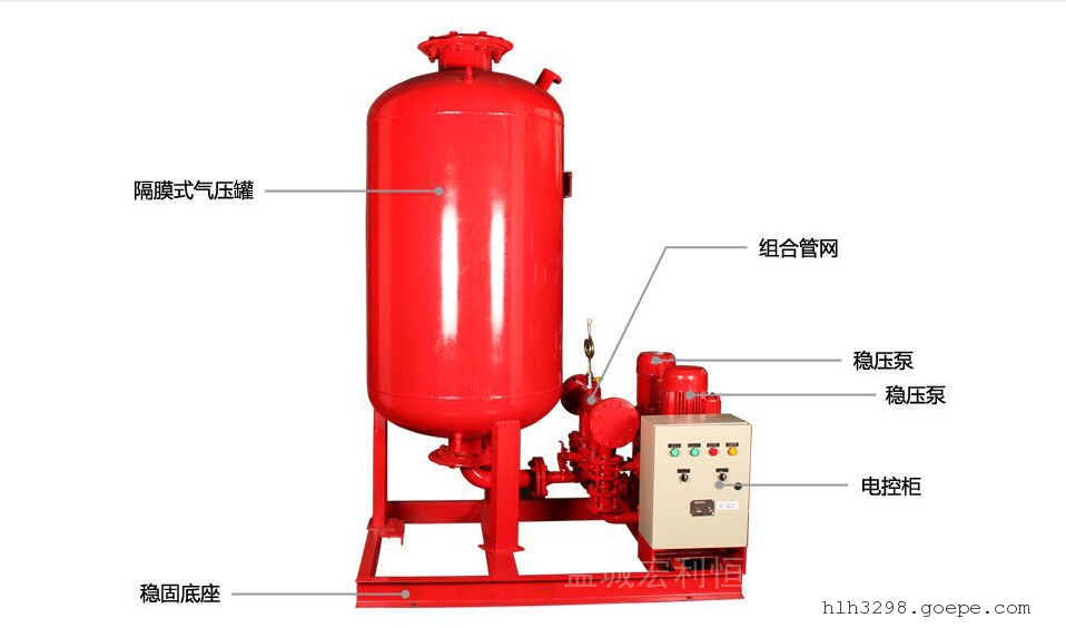 1.消防稳压设备是参照国家建筑标准设计图集98S205等设计制造的消防专用的增压稳压设备。设备由隔膜式气压罐与消防增压泵、电控箱、仪表和管路附件等组成。机电一体化,结构紧凑性强,可靠性好,水泵自动高效运行,无需专人看管,节能效果显著,杜绝二次污染提高水质,启停冲击小,大大提高相关设备使用寿命,平时由稳压泵组将管网压力稳定在设定值,火灾时消防主泵自动启动灭火。并配带有隔振器,无需预埋地脚孔。